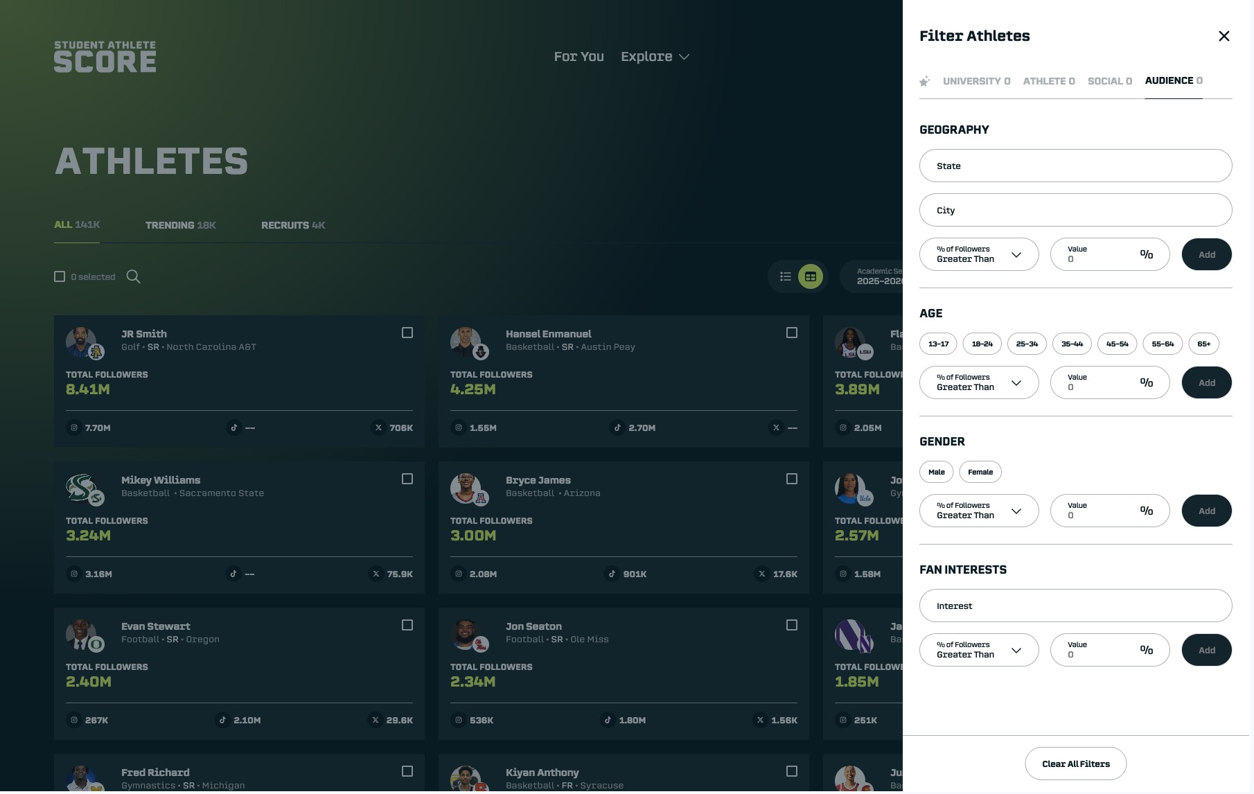 When filtering athletes, there is now an "Audience" tab in the sidebar that can be used to filter athletes based on their social media followers.