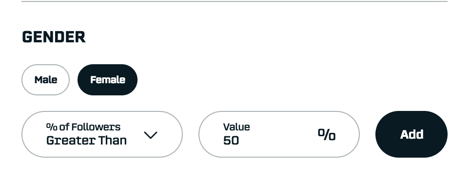 To add a filter, select a filter option, how the filter should be applied (>X% of followers or <X% of followers), and a value in terms of % of followers, then click add.